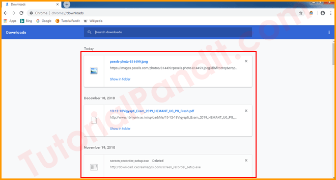 इस प्रकार आप Chrome Browser द्वारा की गई Downloading को देख सकते हैं. अगर आपका Download Destination Default है तो यह आईटम आपके कम्प्युटर में Downloads नाम के फोल्डर में सेव होते हैं.